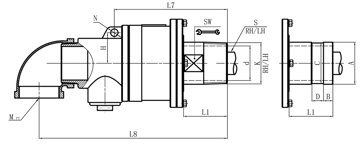 Model K M I O S S1 D1 L1 L2 L3 L5 L6 L7 L8 N SW H 法蘭式外管尺寸對照表