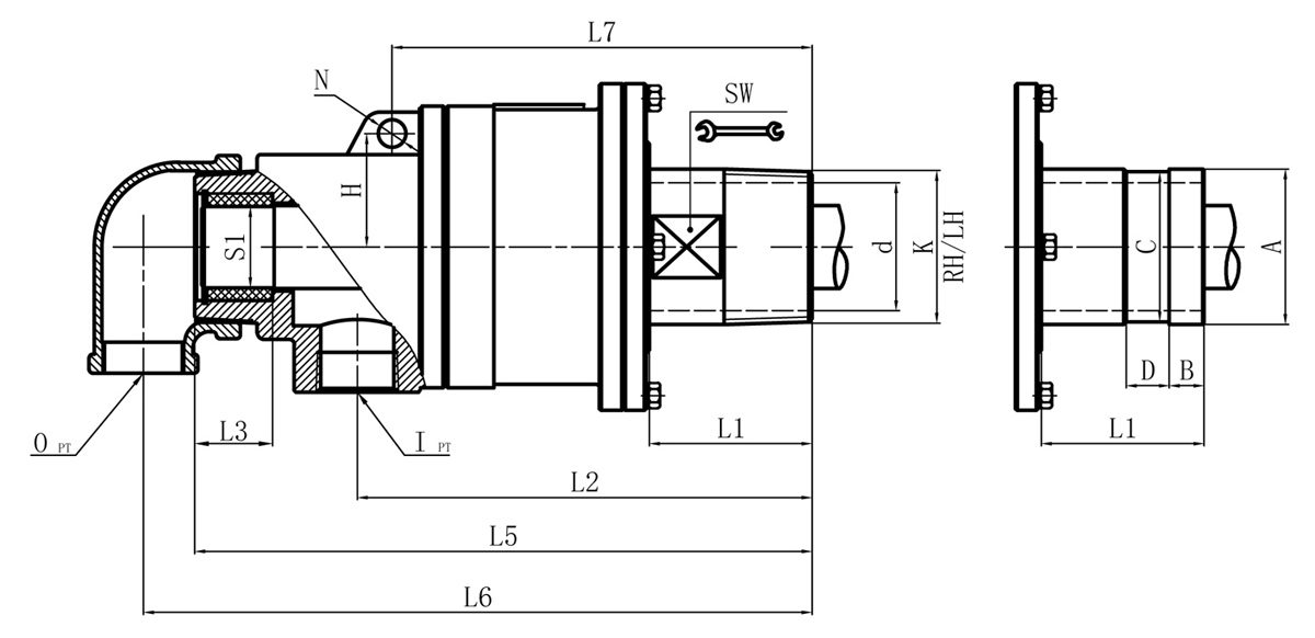 Model K M I O S S1 D1 L1 L2 L3 L5 L6 L7 L8 N SW H 法蘭式外管尺寸對(duì)照表
